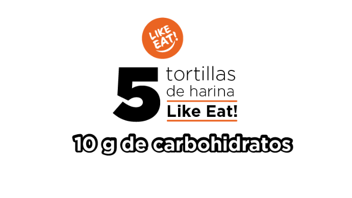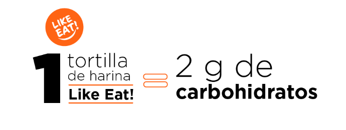 En cambio, UNA de nuestras tortillas Like Eat! tiene solo 2 g de carbohidratos disponibles. Por eso, la equivalencia de que 5 tortillas de harina Like Eat! equivalen a una tortilla de harina regular.
